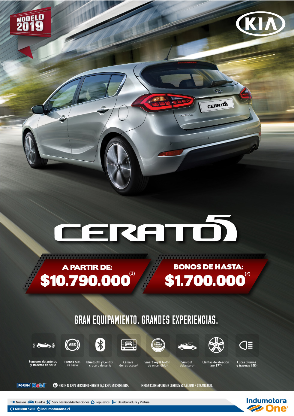 (1)Precio corresponde a versión CERATO5 EX 1.6L 6MT AC ABS e incluye bono de $1.200.000 ($600.000 con cualquier medio de pago, más $600.000 con financiamiento Forum). Precio lista $11.990.000. Crédito Compra Convencional con mínimo de 24 cuotas y un pie de 35% del valor total del vehículo (precio de venta) que corresponde a $3.776.500. Cuota $381.805, CAE 26,79%, Costo Total del Crédito $9.163.320, Costo Total del Vehículo $12.939.820, Monto del Crédito $7.304.536. Stock de 100 unidades. (2)Bono corresponde a versión CERATO5 EX 1.6L 6MT AC ABS CR ($700.000 con cualquier medio de pago, más $1.000.000 con financiamiento Forum). Precio lista $12.690.000. Precio final $10.990.000. Crédito Compra Convencional con mínimo de 24 cuotas y un pie de 35% del valor total del vehículo (precio de venta) que corresponde a $3.846.500. Cuota $388.655, CAE 26,73%, Costo Total del Crédito $9.327.720, Costo Total del Vehículo $13.174.220, Monto del Crédito $7.435.585, Stock de 100 unidades. Crédito sujeto a verificación de antecedentes financieros y comerciales del Cliente. La contratación de cualquier seguro asociado al crédito ofrecido es de carácter voluntario. Crédito incluye gastos operacionales y seguros de desgravamen. Precios no incluye flete a regiones. No válidos para Zona Franca. Válido hasta el 14 de septiembre de 2018. Rendimiento: Valor obtenido en mediciones de laboratorio según el ciclo de ensayo de la Comunidad Económica Europea, homologadas en el Ministerio de Transportes y Telecomunicaciones. Más Información en www.consumovehicular.cl.
